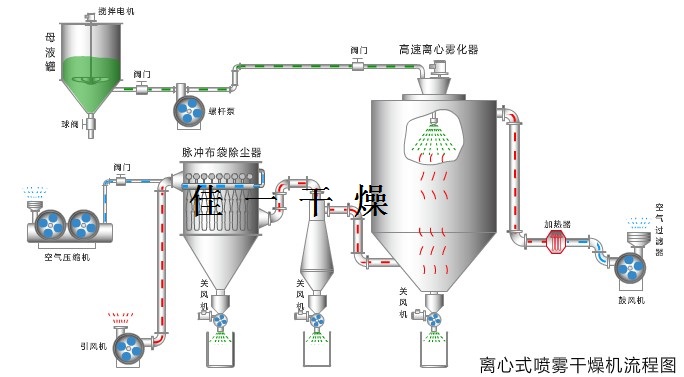 噴霧干燥器是處理溶液、懸浮液或泥漿狀物料的干燥設備。它是用噴霧的方法使物料成為霧滴分散在熱空氣中,物料與熱空氣呈并流、逆流或混流的方式互相接觸,使水分迅速蒸發,以達到干燥目的。采用這種干燥方法,可以省去濃縮、過濾、粉碎等單元操作,直接可以獲得30~500μm的粒狀產品。干燥時間極短,一般為5~30s。不僅適用于耐高溫物料的干燥,同時也適用于熱敏性物料和料液干燥過程中易分解的物料,能有效改善產品流動性和速溶性能。